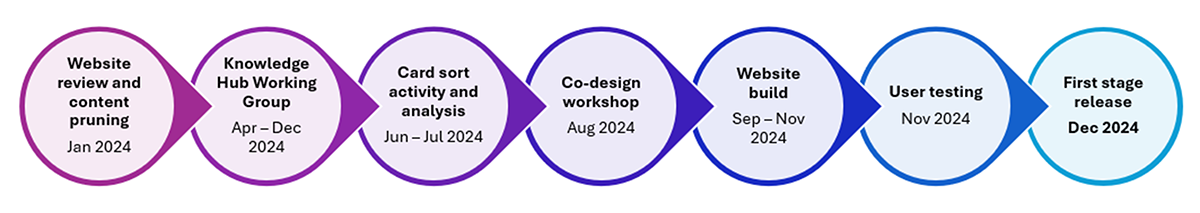 A substantial amount of work underpinned the stepwise approach leading to the first stage release of the new ELDAC website. After the team initially reviewed the website in early 2024 and a Knowledge Hub Working Group was formed, we conducted a card sort activity to better understand how people group certain concepts together. The intention was to explore different ways that we could group information within the new website.